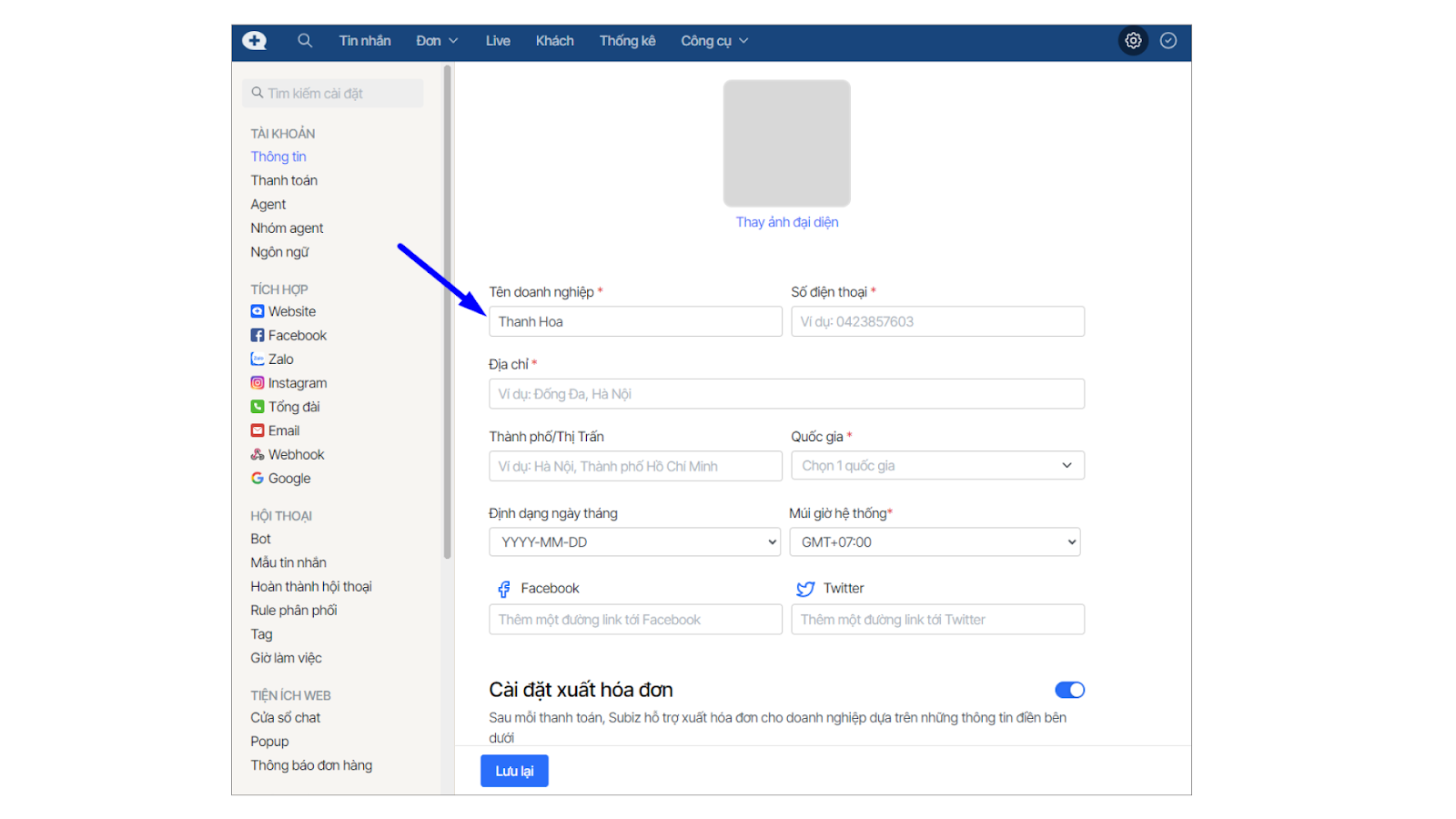 - Nhập các thông tin, thay đổi ảnh đại diện là logo Doanh nghiệp