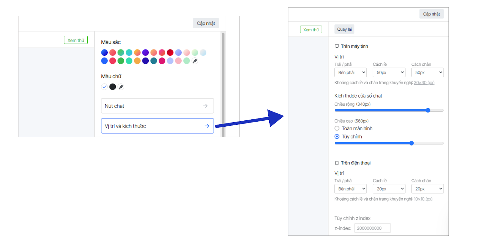 Bạn có thể thay đổi vị trí nút chat Subiz lên cao hay xuống thấp, chuyển sang trái hay sang phải của website.